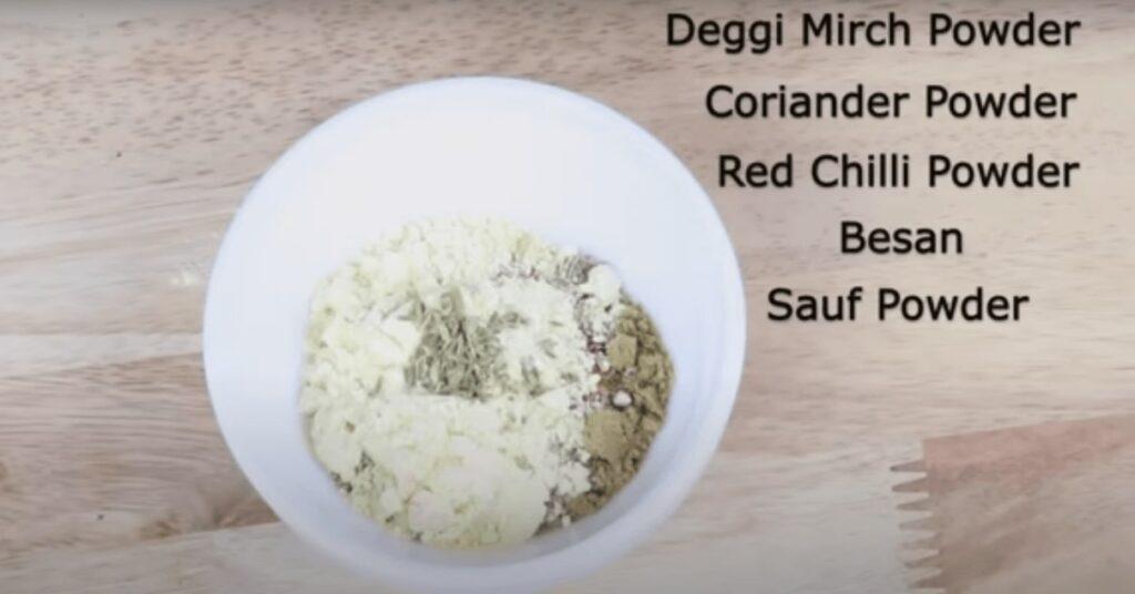 आप चाहे तो अपने हिसाब से कुछ चीजें घटा सकते हैं और कुछ चीजें बढ़ा सकते हैं। वह बिल्कुल आपके ऊपर है। जो इंपॉर्टेंट चीज होंगी वो मैं आपको जरूर बता दूंगा। तो यहां पर सूखे मसाले जो है जो आपको सारे लेने हैं वह है थोड़ी सी देगी मिर्च, काफी सर धनिया पाउडर, इसके साथ आपको चाहिए होगा थोड़ा सा लाल मिर्च पाउडर और बेसन। अगर आपको मिल सके तो इसमें सौंफ का पाउडर जरूर डालें थोड़ा सा ही डालना है लेकिन सौंफ के पाउडर का जो टेस्ट आता है वह बहुत ही बढ़िया है।