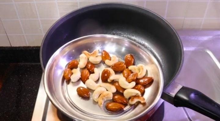 तो काजू और बादाम को ऐसे धीमी आंच पर थोड़ा सा रोस्ट कर लें इससे हलवे में बहुत अच्छा फ्लेवर आता है।